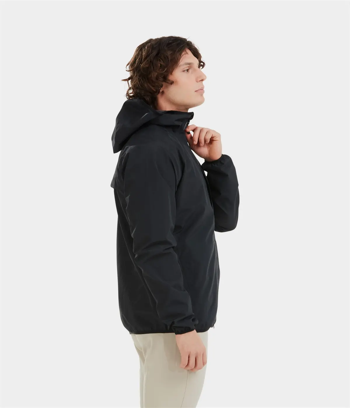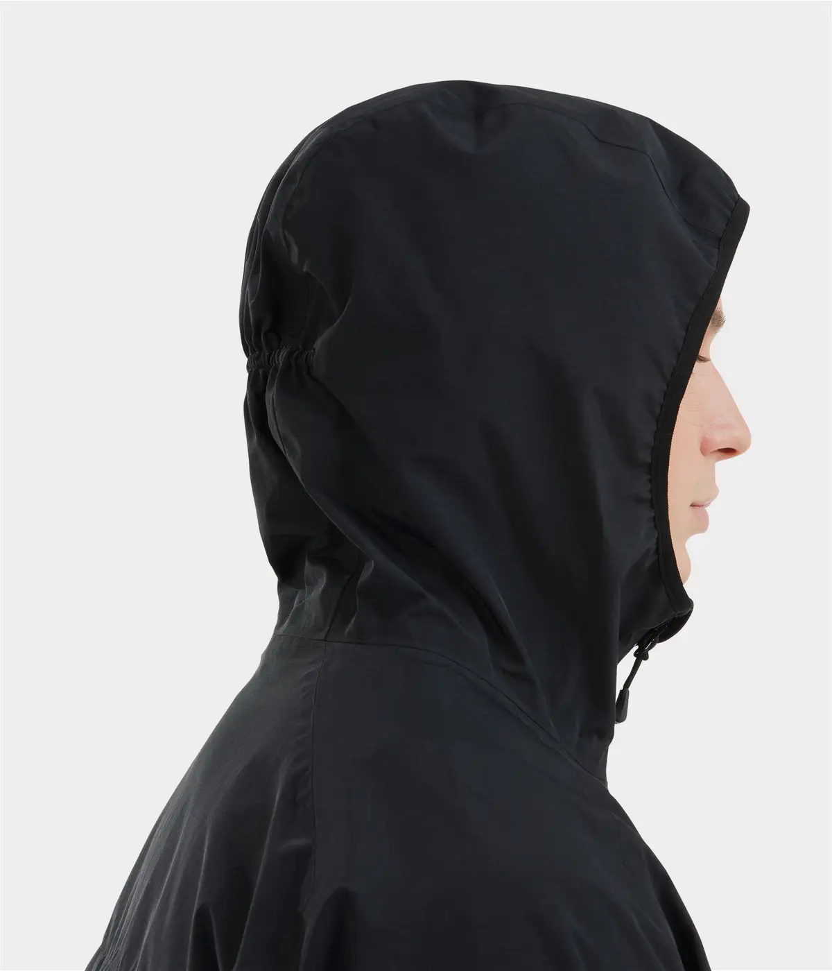 Légère, tous les systèmes d’ajustement ont été étudiés pour préserver le poids de la veste. La capuche et les poignets s’ajustent grâce à de fines bandes élastiques.